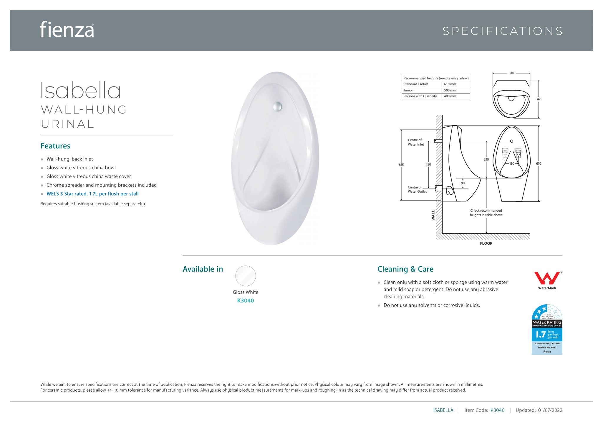 Fienza Isabella Wall Hung Urinal – the pinnacle of modern design and functionality in commercial and residential washroom solutions. Crafted with meticulous attention to detail, this urinal redefines convenience, hygiene, and style in any restroom setting.